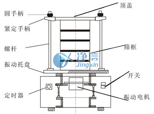 三、把被檢物料放入最上端的標準篩具里,(或蓋上標準篩具上蓋)然后用套在絲柱上的篩分頭壓住標準篩具,旋緊絲柱上的螺母來壓緊標準篩具。(注意:兩側要用力一致,然后用鎖定螺絲鎖緊。)