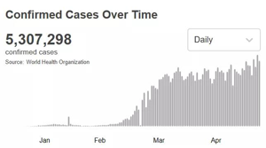 根據(jù)世衛(wèi)組織最新實(shí)時(shí)統(tǒng)計(jì)數(shù)據(jù),截至北京時(shí)間5月26日0時(shí)42分,全球累計(jì)新冠肺炎確診病例5307298例,死亡病例342070例。